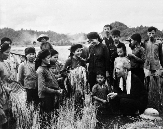 | Chủ tịch Hồ Chí Minh thăm nông dân xã Hùng Sơn, huyện Đại Từ, tỉnh Thái Nguyên đang thu hoạch vụ lúa đầu tiên sau cải cách ruộng đất (1954). (Ảnh: TTXVN) |