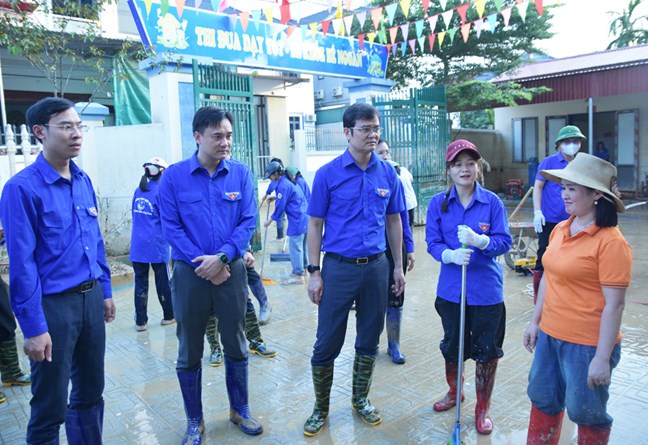 Tiếp đó, đoàn đến thăm, động viên lực lượng thanh niên tình nguyện hỗ trợ khắc phục bão lũ tại xã Hợp Thịnh. Trong đợt lũ vừa qua, Đoàn xã Hợp Thịnh đã huy động hàng nghìn lượt đoàn viên thanh niên tham gia các hoạt động như: Đắp đê, hỗ trợ người dân di chuyển đồ đạc đến nơi an toàn; nấu các suất ăn, hỗ trợ kết nối đưa các nguồn viện trợ của tổ chức, cá nhân đến với bà con bị cô lập bởi lũ lụt; tham gia dọn vệ sinh môi trường các trường học, trạm y tế và các hộ dân khi nước rút...