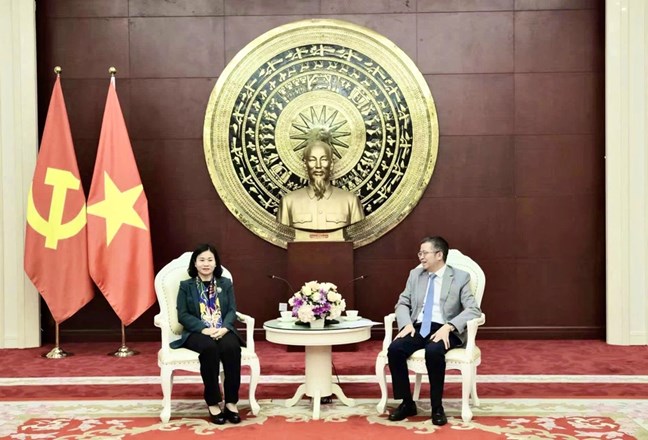 | Ủy viên Trung ương Đảng, Phó Chủ tịch Ủy ban Trung ương MTTQ Việt Nam, Chủ tịch Hội LHPN Việt Nam Nguyễn Thị Tuyến trao đổi với ông Phạm Thanh Bình, Đại sứ Việt Nam tại Trung Quốc |